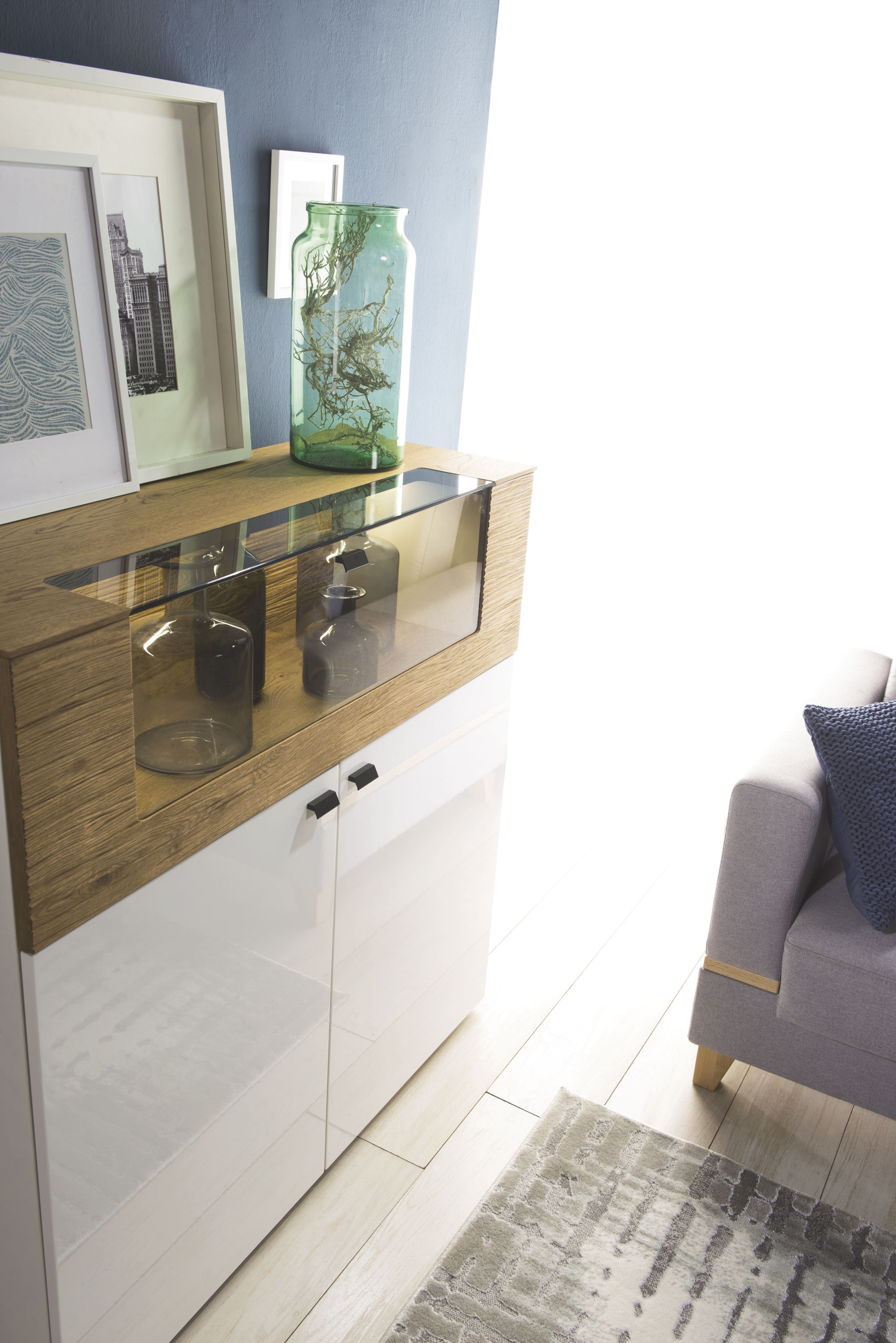 Rückwand & shelves : MDF (Medium density wood fibreboard ), veneered & lackiert