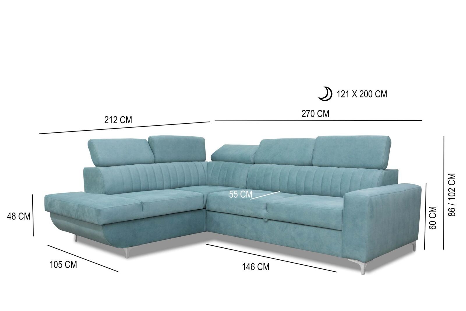 Upgrade your living space with the Blue e Couch Living landscape Fabric Corner Sofa! This L-shape furniture piece by XL Furniture is the ultimate combination of style and comfort. Made with high-quality textile material, this sofa offers a cozy seat with dimensions of 270 cm x 212 cm on one side and 212 cm x 270 cm on the other. The seat height of approximately 48 cm and a seat depth of approximately 55 cm ensure a relaxing lounging experience. In addition to its modern design, this corner sofa provides versatility with a lying surface of approximately 121 x 200 cm, perfect for relaxation or hosting guests. The sofa's height ranges from 86 cm to 102 cm, with a depth of approximately 105 cm, offering ample space for your living room. Customize your Blue e Couch with a color of your choice from a wide selection, including Sapphire Blue, Sky Blue, and more. Elevate your home decor with this sophisticated and stylish piece that is sure to become the focal point of your living room. Experience luxury and functionality with the Blue e Couch Living landscape Fabric Corner Sofa!