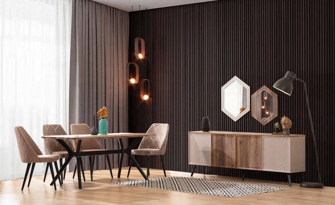 Beige, Dining room, Modern, Dining room suite, Dining table, Sideboard, Mirror, Furnishings, Stylish