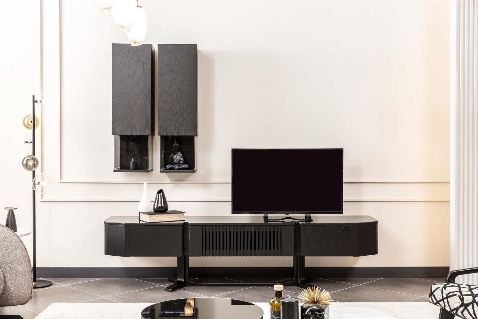 Black Wall unit Set Designer Wood TV Lowboard Luxurious x2 Wall Shelves