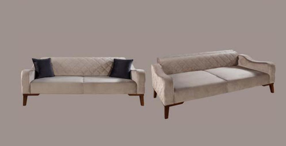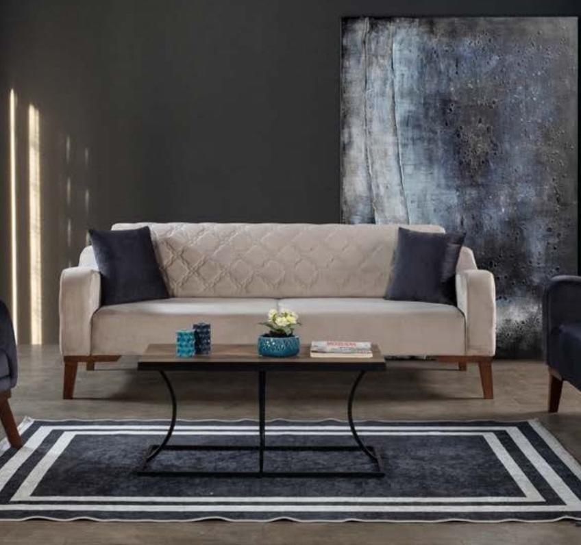 Beige three-seater couch, elegant sofa, living room, seating furniture, velvet