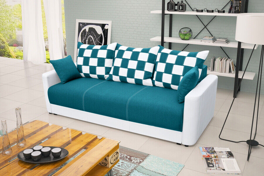 Upgrade your living space with our versatile Sofa bed 3-Seater with sleeping function from XL Furniture. This comfortable folding sofa not only provides ample seating during the day but also transforms into a cozy bed at night, thanks to its bed function that offers an approx. 192 x 142 cm lying surface. Customize this modern piece with your choice of color from a wide selection including Emerald Green, Sky Blue, Rose Gold, and more. You can also choose between different fabric or premium imitation leather options to suit your style preferences. Crafted with an inner frame made of real wood and a durable spring core, this sofa bed is both stylish and functional. Make it the centerpiece of your home with its dimensions of approx. 220 cm in length, 10 cm in height, and 98 cm in depth. Upgrade your home decor with this sleek and multifunctional sofa bed. Contact us today to personalize the dimensions or colors to fit your unique style!